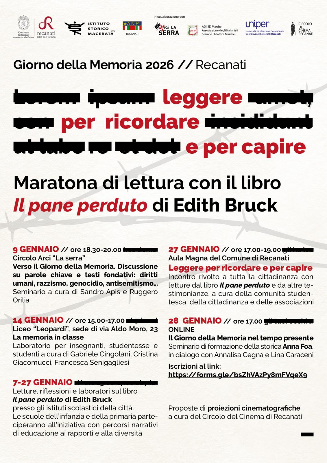 Leggere per non dimenticare. Recanati ha celebrato il Giorno della Memoria 2026 con numerose iniziative dedicate alla cittadinanza e in particolare agli studenti degli Istituti scolastici del territorio che, a partire dal 14 gennaio scorso, hanno affrontato letture, incontri, percorsi narrativi e laboratori sul tema a partire da letture scelte del libro ‘Il pane perduto’ della sopravvissuta alla Shoa Edith Bruck.